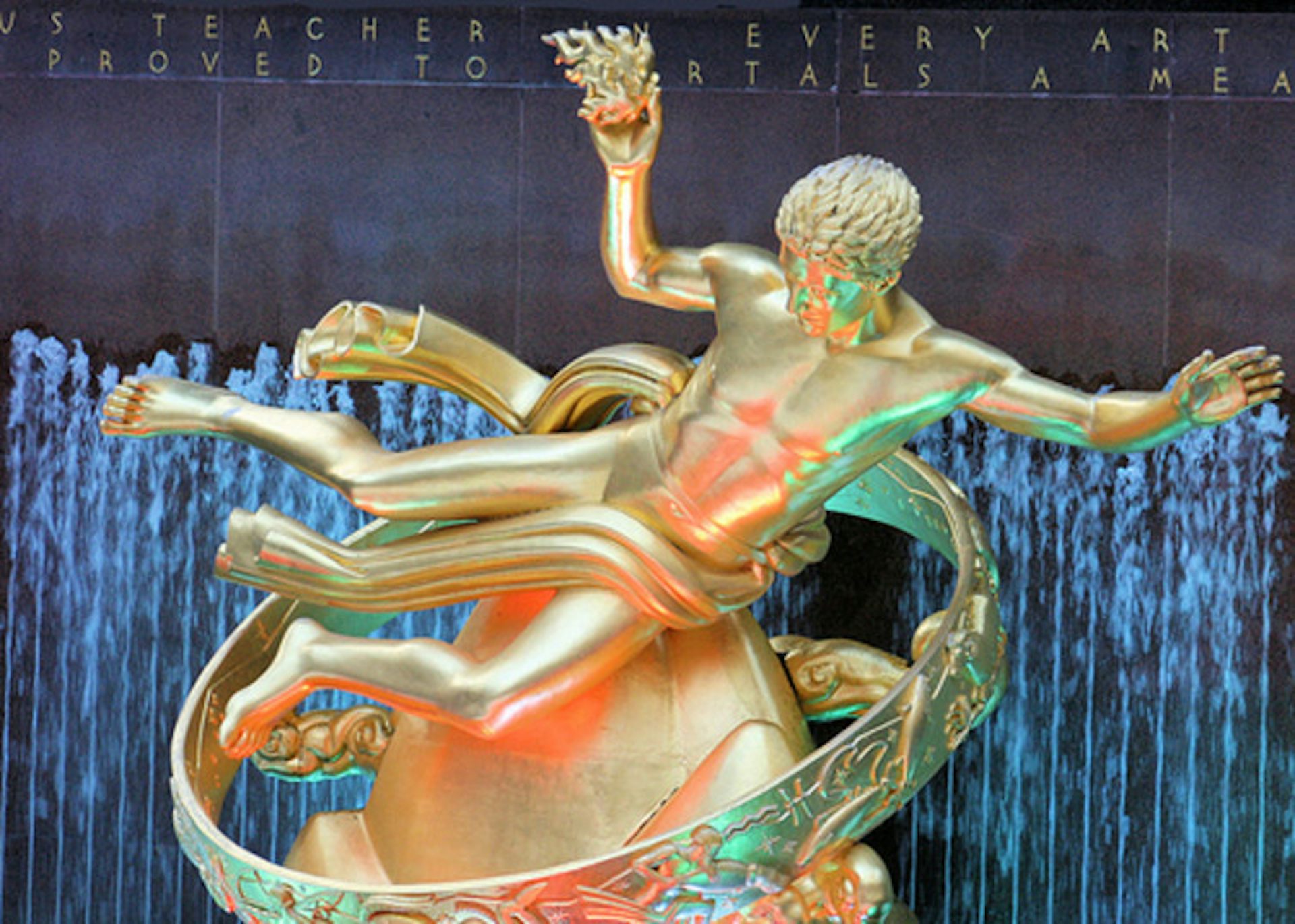 Prometheus statue at Rockefeller Center, Manhattan. The inscription behind it is a paraphrase of Aeschylus that reads: “Prometheus, teacher in every art, brought the fire that hath proved to mortals a means to mighty ends.”